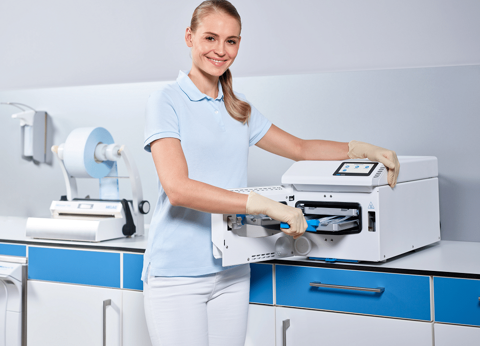 - Quickly installed, sterilized everywhere. Our plug & play installation concept enables lightning-fast installation at any desired location – with 60% less space required than conventional autoclaves. (Now new: With connection set, also compatible with MELAdem)